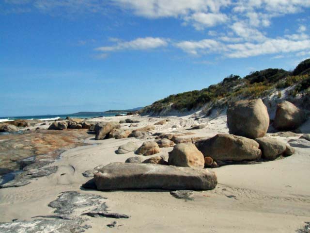 The first feature along here is Point Jedacorrudup. Following the beach further brings you to a series of small headlands. The track leaves the beach and then travels over rocky terrain back onto another beach. Some of the headland tracks require a degree of ground clearance. Eventually the track ends at Arrid Bay.