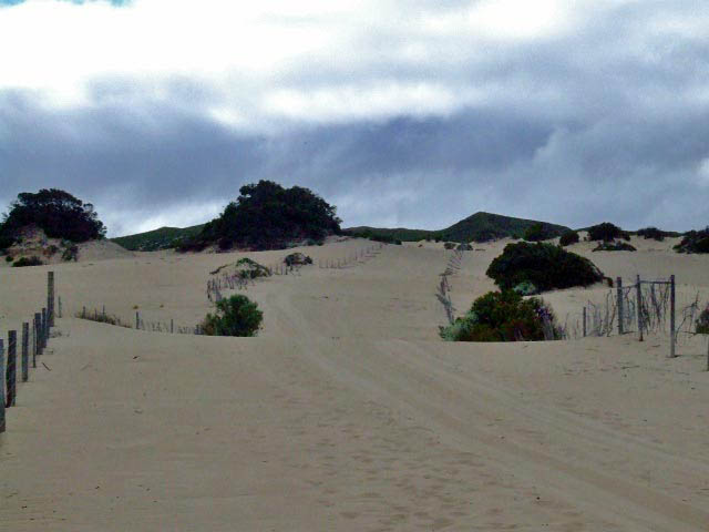 The dune area has a fenced path through it and is generally flat. Sometimes due to the action of the wind, a soft white powder can be deposited at the crest of the sandy hill near BH24. There is quite easy access to the beach at BH27 and the track does travel in a southerly direction along a rocky shoreline.