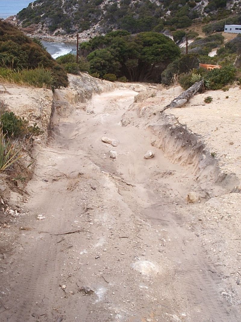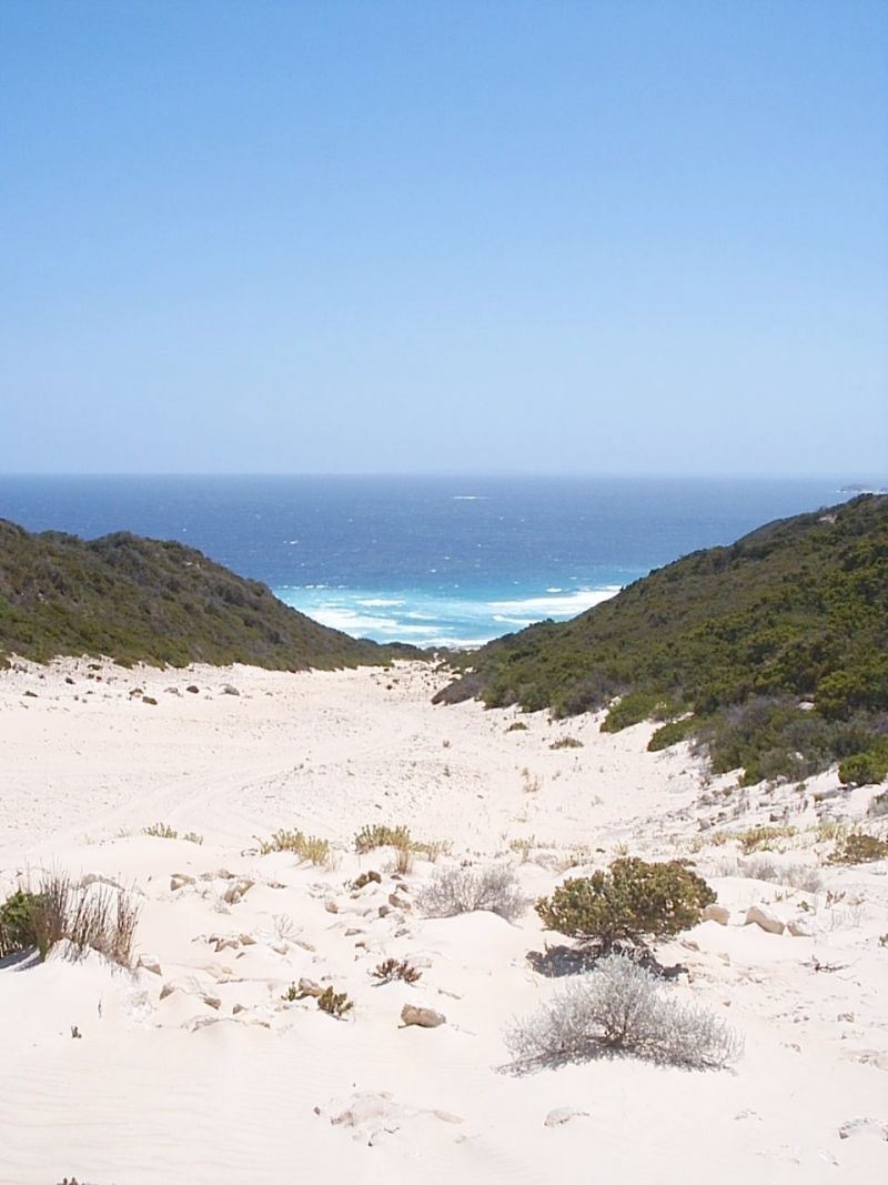 Navigating thru the dune area can be hazardous for the unwary, though keeping the bush within sight on your right will bring you to a defined track that will take you down to the beach between two hills. There is another track off the beach at the western end and this is very sandy and steep. Though we did not travel this, an enquiry to a local pointed out that it exits/starts at the two strainer posts within the first 1.5km in and could possibly be called Minarup rd.